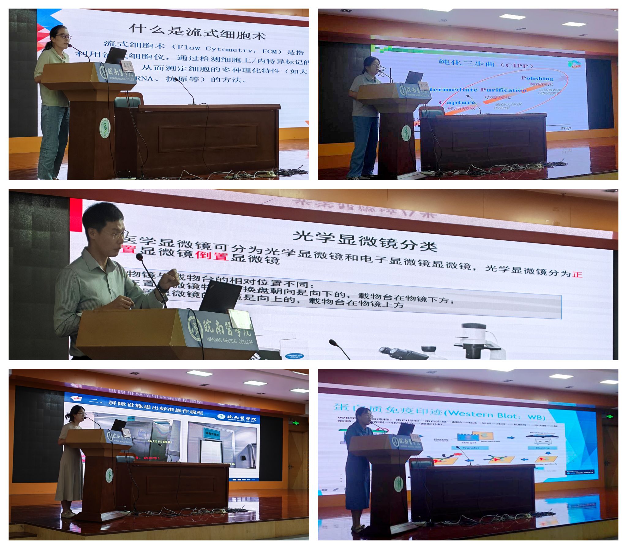 培训会上,校SPF级动物实验室技术人员详细讲解了实验动物的类别、屏障设施、标准化操作规程、运行与管理及注意事项等内容,列举近年来动物实验室违规案例,重点强调了动物实验室准入机制、运行规范及突发事件应急措施等。中心实验室技术人员依次开展了流式细胞仪、蛋白质纯化仪、全自动蛋白印迹定量分析系统、激光共聚焦显微镜等大型仪器专题理论培训,详细介绍了各台仪器的原理、构成、应用及操作流程等。