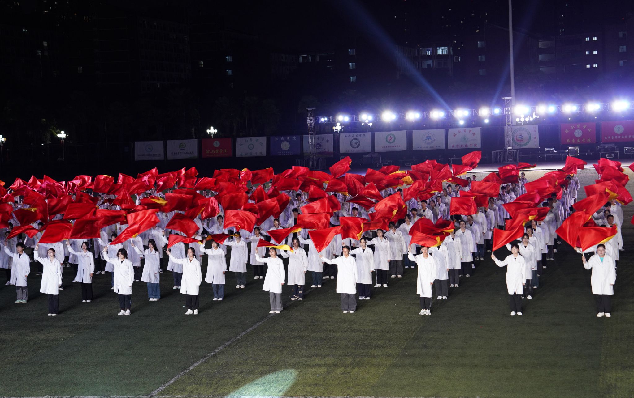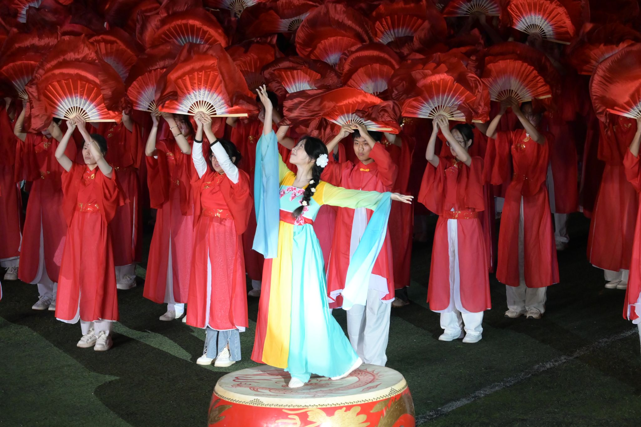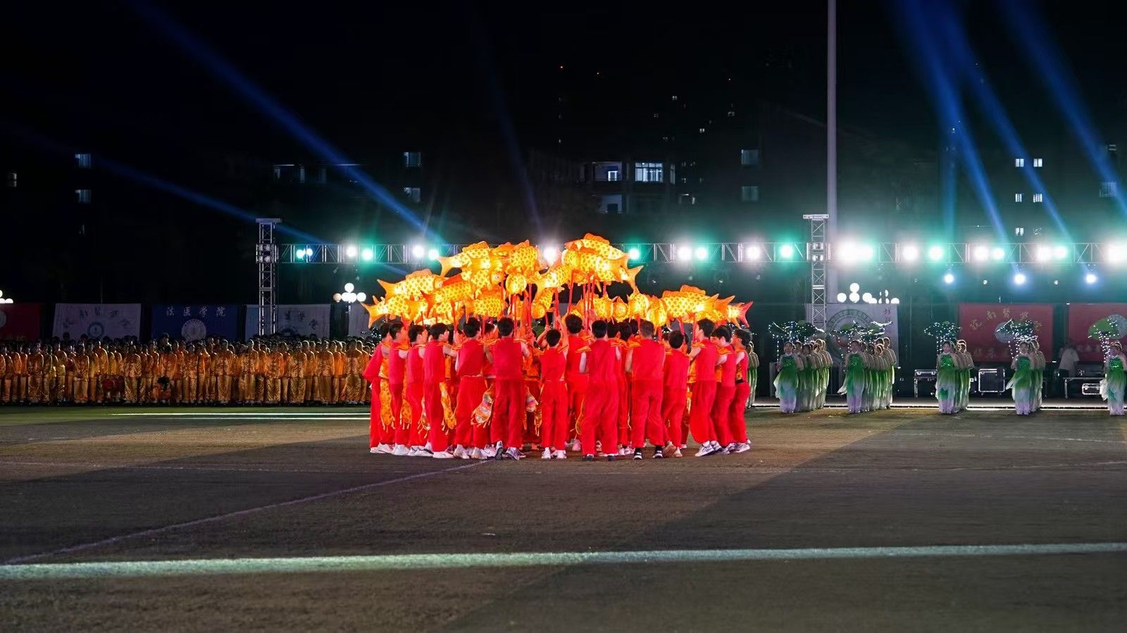 流光溢彩展风采,凝心聚力谱华章。今年的开幕式与往年不同,精彩纷呈、声势浩大的文艺表演配合绚丽的舞台、璀璨的灯光,给师生带来了一场美轮美奂的视觉盛宴。文艺汇演以《祥龙瑞狮》拉开序幕,表演者以矫健的身姿、灵动的表演展现了中华传统文化的魅力和团结奋斗、勇往直前的精神;非遗表演《鱼跃龙门》中,各只小鱼在表演人员的舞动下,时而聚拢,时而嬉戏,穿梭在荷叶之间,表达了对学子们学业有成的美好祝愿和对医学事业的孜孜追求;《非遗之光》将滚灯与太极拳相结合,动静相宜,在一招一式中尽显医学生内外兼修、刚柔并济的精神面貌;舞蹈表演《同爱同在》活力四射、朝气蓬勃,充分彰显了青年学子对医学事业的热爱和挑战自我、积极进取的奋进姿态;《大雅国风》深情致敬传统文化,在坚定文化自信中谱写新时代青年的青春答卷;《旗开得胜》表演者高举旗帜、振臂挥舞,展现了皖医学子无畏困难、勇往直前的青春风采;离退休老同志带来的扇子舞表演《祝福祖国》,用手中的彩扇编织成祖国万岁的图案, 表达了老同志对祖国的无限深情和对美好生活的热爱。运动场上,灯火献礼,璀璨夺目,不仅点亮了皖医的夜空,更照亮了新征程的道路。