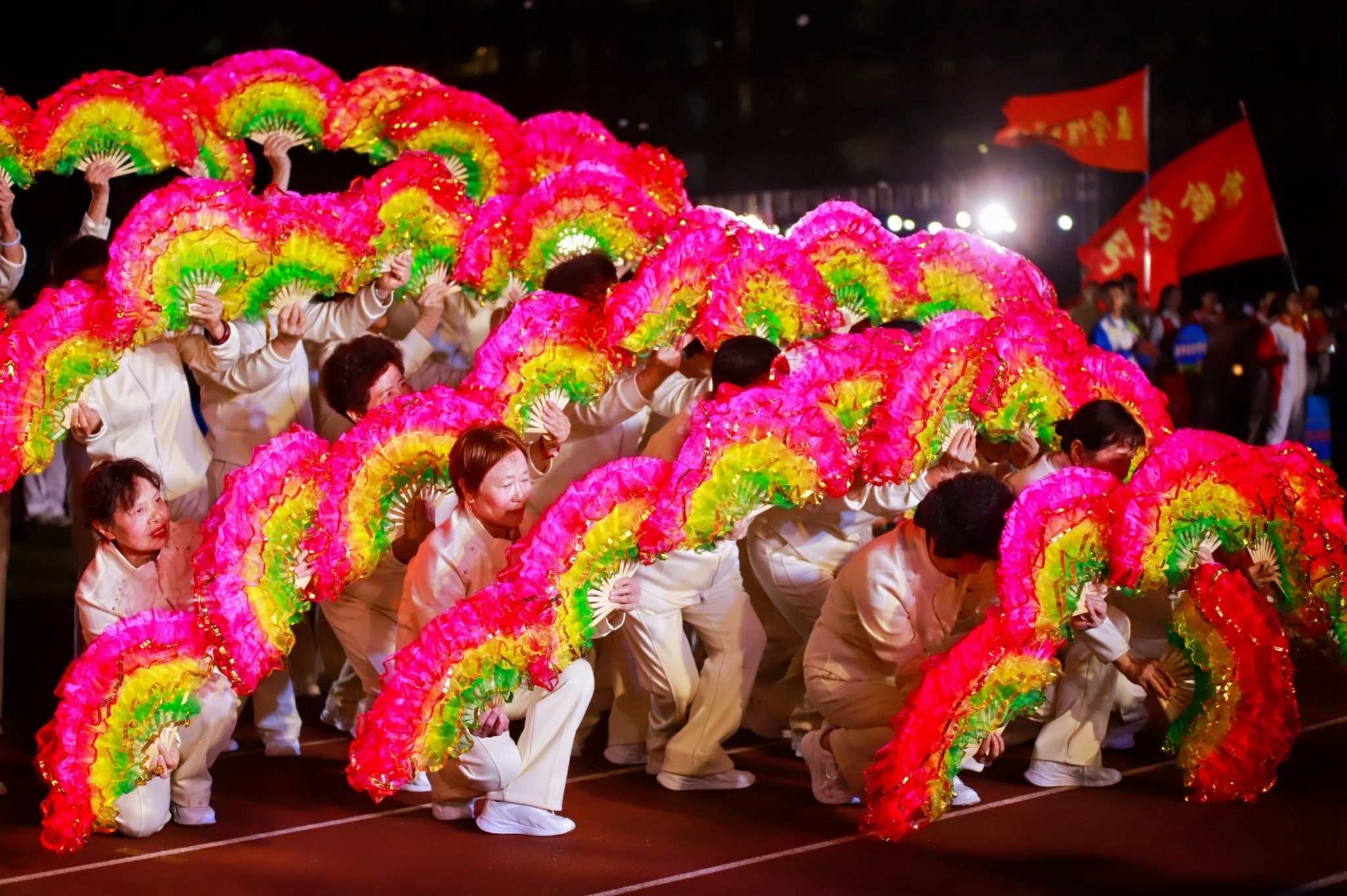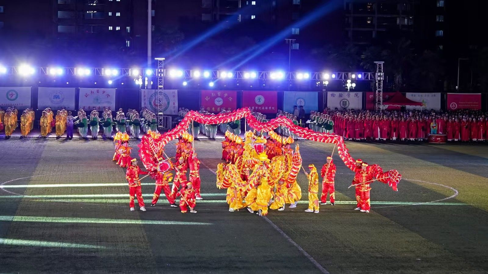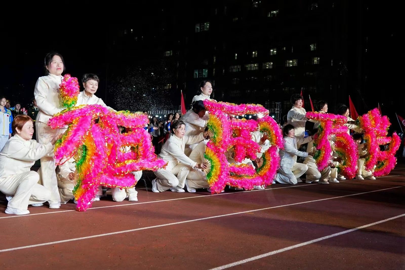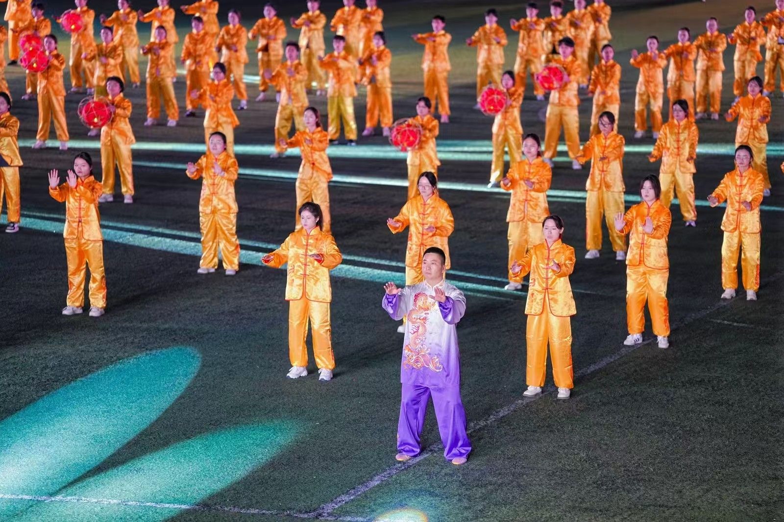 流光溢彩展风采,凝心聚力谱华章。今年的开幕式与往年不同,精彩纷呈、声势浩大的文艺表演配合绚丽的舞台、璀璨的灯光,给师生带来了一场美轮美奂的视觉盛宴。文艺汇演以《祥龙瑞狮》拉开序幕,表演者以矫健的身姿、灵动的表演展现了中华传统文化的魅力和团结奋斗、勇往直前的精神;非遗表演《鱼跃龙门》中,各只小鱼在表演人员的舞动下,时而聚拢,时而嬉戏,穿梭在荷叶之间,表达了对学子们学业有成的美好祝愿和对医学事业的孜孜追求;《非遗之光》将滚灯与太极拳相结合,动静相宜,在一招一式中尽显医学生内外兼修、刚柔并济的精神面貌;舞蹈表演《同爱同在》活力四射、朝气蓬勃,充分彰显了青年学子对医学事业的热爱和挑战自我、积极进取的奋进姿态;《大雅国风》深情致敬传统文化,在坚定文化自信中谱写新时代青年的青春答卷;《旗开得胜》表演者高举旗帜、振臂挥舞,展现了皖医学子无畏困难、勇往直前的青春风采;离退休老同志带来的扇子舞表演《祝福祖国》,用手中的彩扇编织成祖国万岁的图案, 表达了老同志对祖国的无限深情和对美好生活的热爱。运动场上,灯火献礼,璀璨夺目,不仅点亮了皖医的夜空,更照亮了新征程的道路。