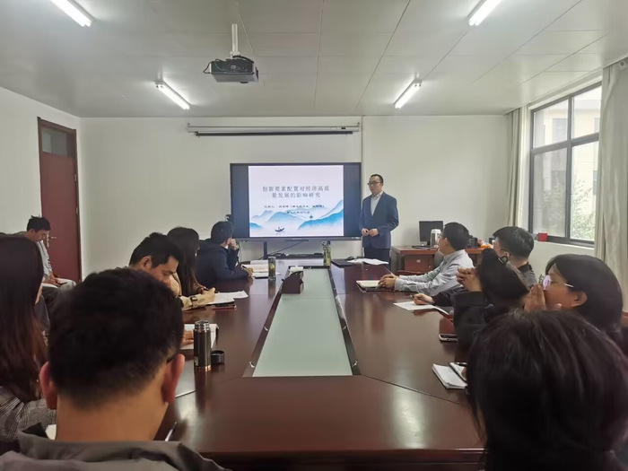 徐朋辉结合自身的研究领域,以“创新要素配置对经济高质量发展的影响研究”为题作学术交流报告。报告主要介绍了创新要素配置机制、配置现状,以及创新要素配置对经济高质量发展的直接影响、间接影响和空间影响效应。报告结束后,现场教师展开了热烈讨论,进行思想碰撞,产生了一些新观点、新思路。