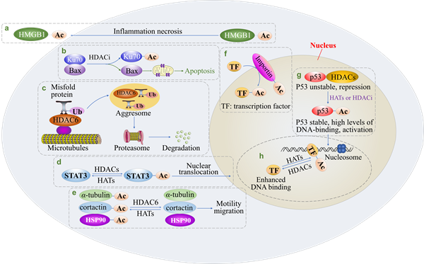 组蛋白去乙酰化酶(Histone deacetylases, HDACs)作为表观遗传重要的调控因子,其通过调控各自底物的乙酰化状态或与生物大分子一起形成复合物而广泛参与基因转录、细胞增殖、细胞周期、细胞凋亡、细胞运动、细胞自噬、肿瘤发生和发展及错误蛋白降解等多种生物学进程(图2),已成为药物化学领域的热门靶点。