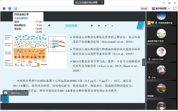贺君博士以G26期牛蛙蝌蚪亚慢性暴露于低浓度MC-LR环境为研究对象,以毒素蓄积、组织结构病理、消化吸收能力、肠道通透性、细菌异位及肠道粗提物抑菌能力等为研究指标,着重探究MC-LR的暴露对蝌蚪肠道的毒性及其作用机理。其研究结果将为评价微囊藻毒素对蛙科动物肠道屏障的毒性提供实验依据,也为进一步阐明环境污染物对动物肠道屏障作用机制提供研究思路。整场报告内容精彩、语言流畅,给与会人员留下深刻印象。