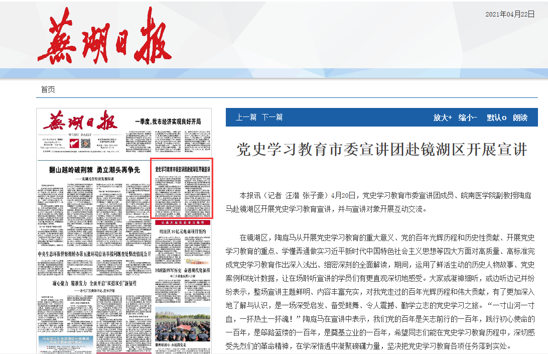 【芜湖日报】党史学习教育市委宣讲团赴镜湖区开展宣讲